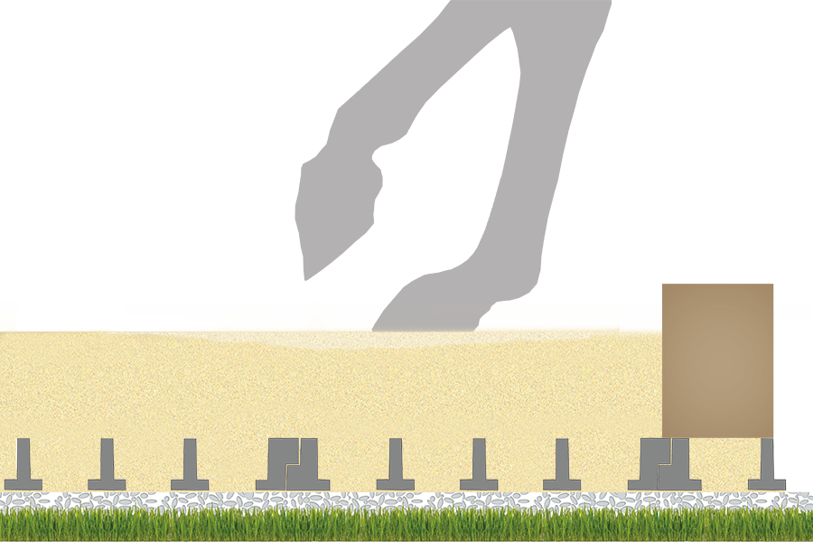 Das flächenelastische Verhalten bietet eine konstante Stossdämpfung mit idealen Reiteigenschaften, gleichzeitig schont es die Gelenke des Pferdes ohne die Sehnen und Bänder zu belasten. Die Holzschicht wirkt zudem isolierend sowie als Wasserspeicher für Trockenperioden.Der On-top-Aufbau